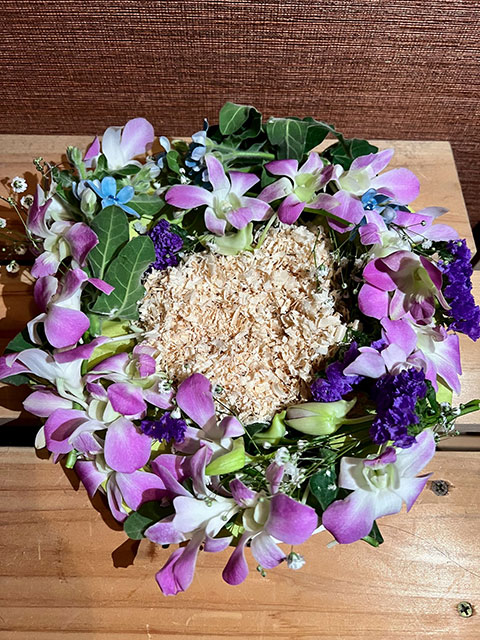 骨壼、骨袋、思い出のフレーム、キーホルダー、缶(最後に拾えない灰の部分や小骨)、こちらもサービスで差し上げております。缶にお入れした灰は、お庭や植木鉢などの土に還して季節の開花で一緒に過ごした日々を思い出して頂けたら幸いです。